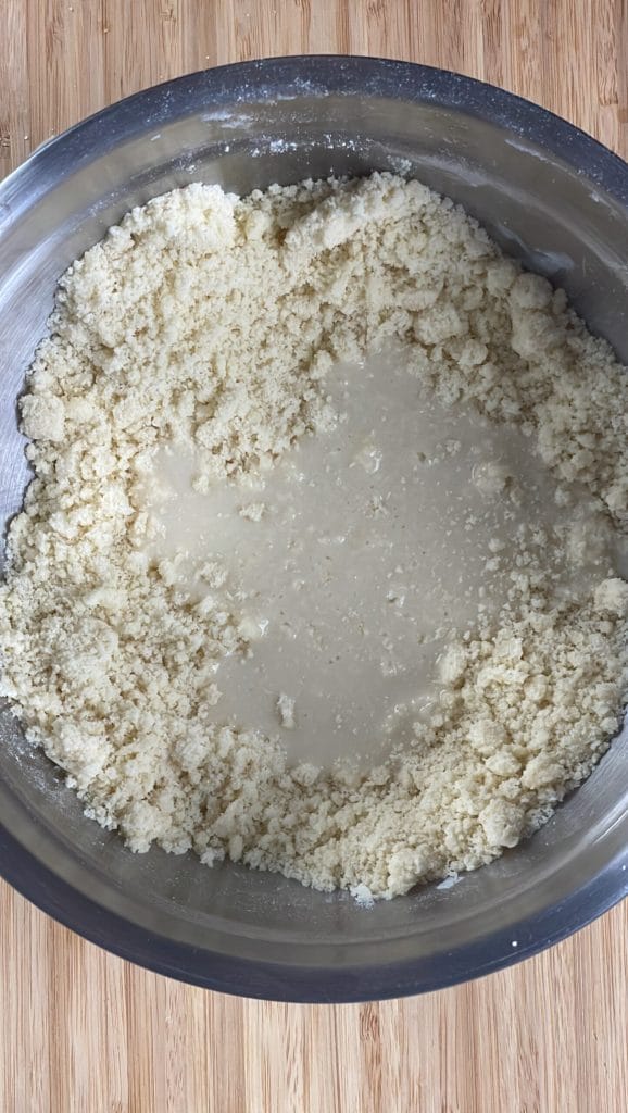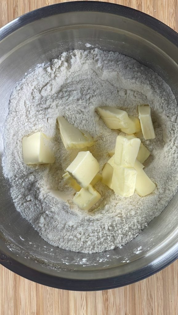 Weigh the cold cubed butter in the same bowl.Mix well with a fork or your hands until you get a sandy mixture.