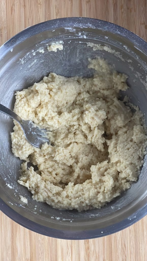Add the milk at this point. Alternatively, you can use cream for a richer dough.