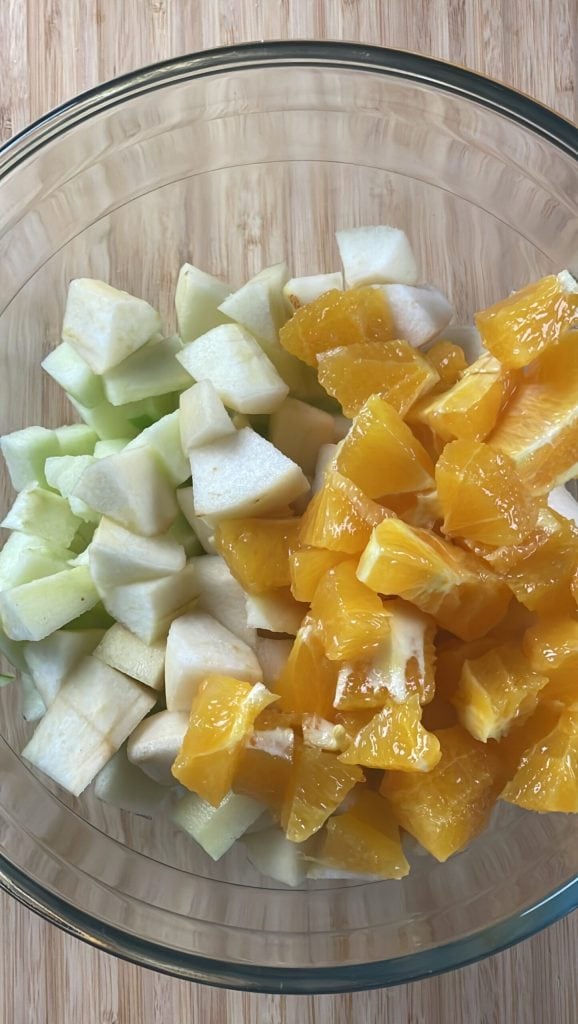 In this version of the cobbler, I used typical ingredients of this season: Granny Smith apple, pears, and oranges. The Granny Smith apple, with its tart and fresh flavor, pairs perfectly with the sweetness of the pears, while the oranges add a citrus note that gives freshness and aroma to the dessert.