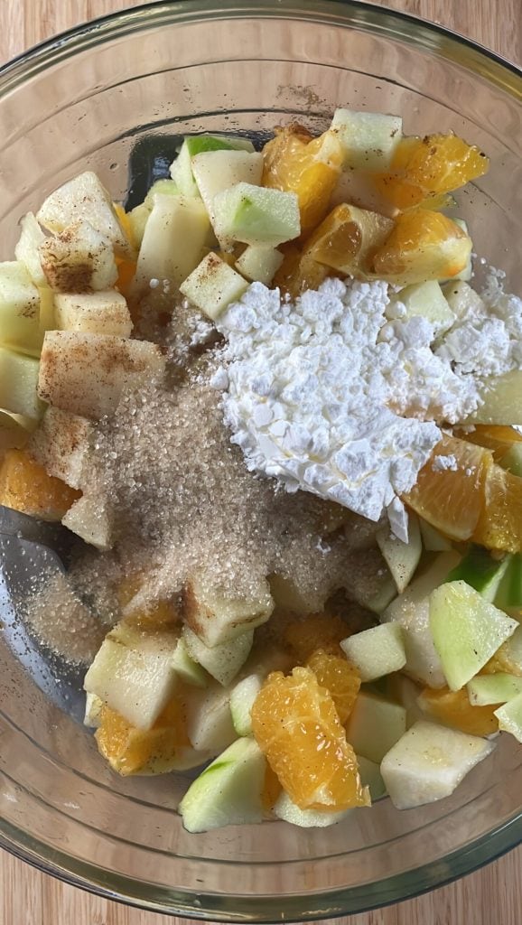 Transfer all the fruit to a bowl.Add the ground cinnamon, brown sugar, and cornstarch to the fruit.