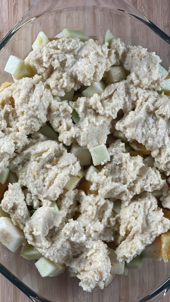 It doesn’t need to be too precise.Bake the winter fruit cobbler in a static oven at 350°F for about 30 minutes or until the topping is golden brown.