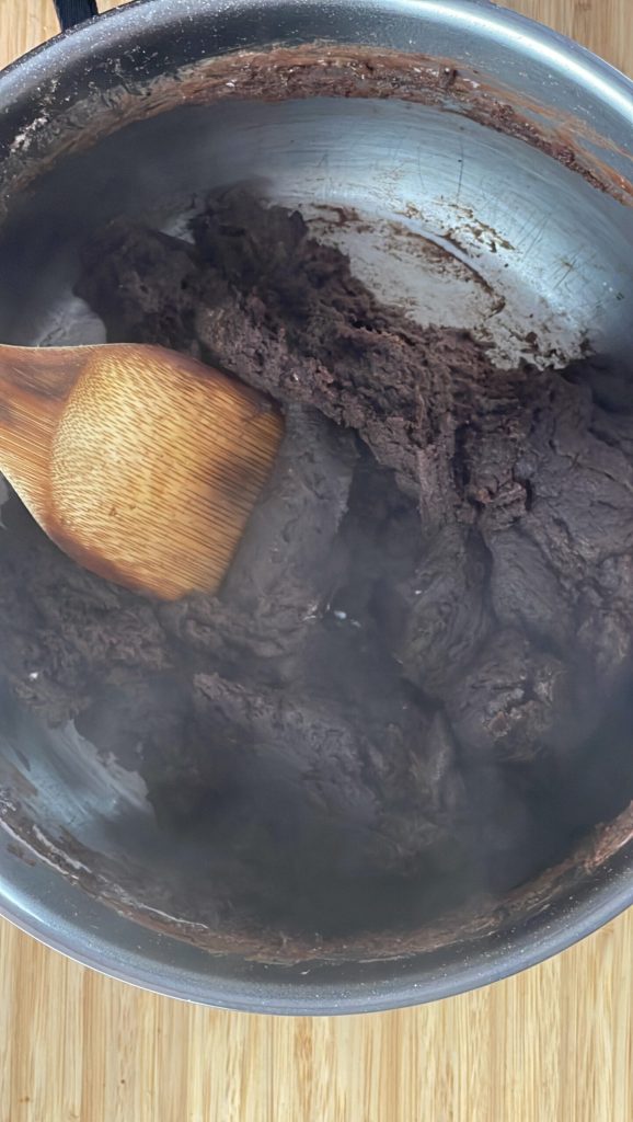 Add the vanilla powder as well.Mix with a wooden spoon until it forms a compact dough that comes away from the sides of the saucepan.