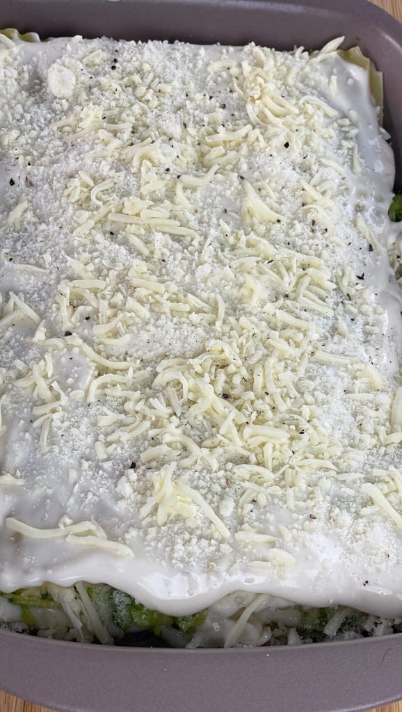 Repeat the process for another two to three layers.Finish the lasagna with a slightly more generous layer of bechamel, pecorino romano, pizza mozzarella, and black pepper.