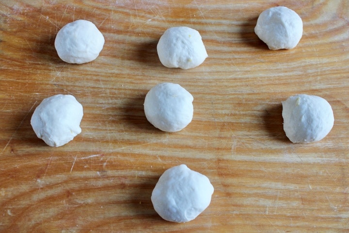 After the rising time, place the dough on a work surface and divide it into about 6 – 7 balls, depending on the size you want. I divided it into 7 balls, each weighing about 2.4 oz. Let them rest for about half an hour.