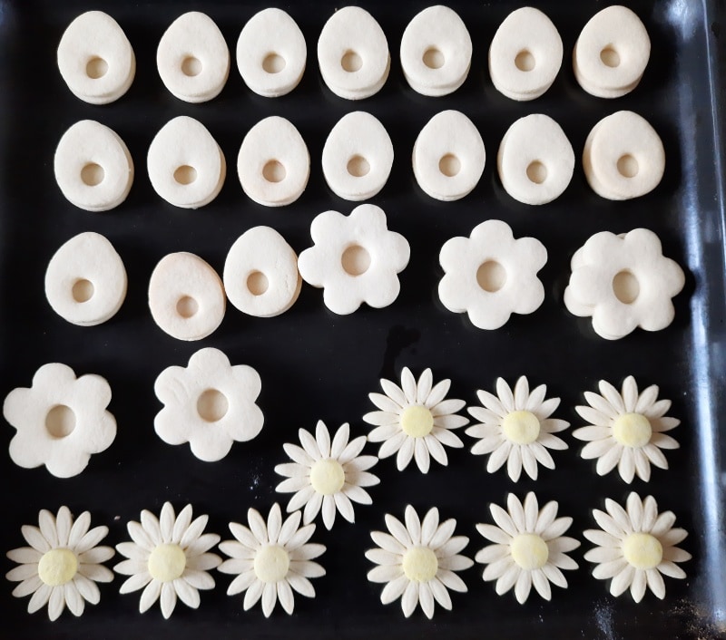 - as needed food coloring (yellow – to add to a small piece of shortcrust to make chick-shaped cookies and the center part of the flowers)