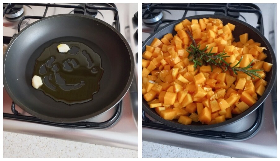 First, cut the pumpkin into small pieces and flavor it in a pan with 3 tablespoons of extra virgin olive oil, two cloves of garlic, and the rosemary, for about 10 minutes.
