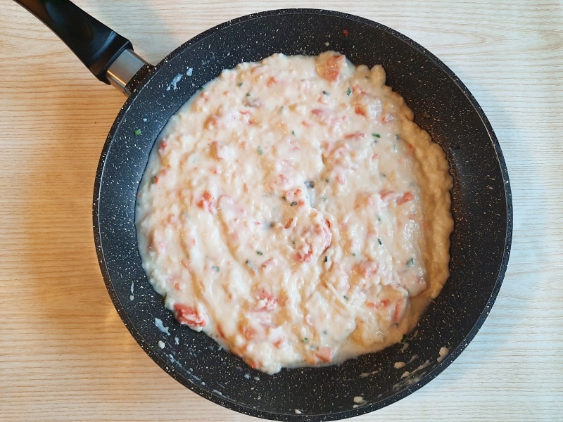 Heat the butter in a large pan and gently sauté the smoked salmon (cut into strips) for a few minutes, just until it changes color: do not overcook to prevent it from drying out. If using fresh salmon, clean it by removing the skin and bones, then cut it into cubes.
