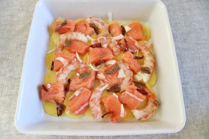 Place a layer of salmon, cut into pieces, on top, distribute part of the shrimp tails (set aside 5 – 6), the sliced onion (set a little aside to sauté the shrimp tails for the end), a couple of sun-dried tomatoes cut into cubes or strips, and a few pieces of anchovy.