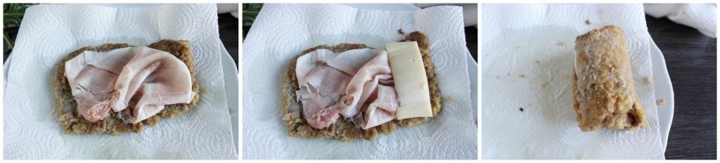 As they cook, place the slices on a plate and cover with cooked ham and thinly sliced fontina. Roll starting from the point where the fontina is.