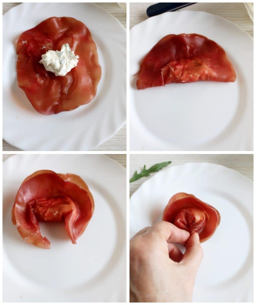 • Place the bresaola slices on a plate, put a teaspoon of filling in the center of each slice. Fold the bresaola slices in half, forming a half-moon, and then join the ends of the half-moon to form a real tortello, pinching the two ends with your fingers to make them stick together.