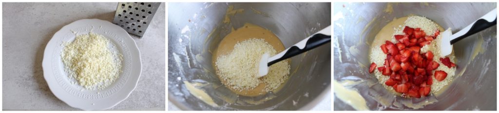 • After the time has passed, reduce the speed of the mixer and gradually add the yogurt and oil, the lemon zest, and finally the flour and potato starch sifted with the baking powder. Mix the mixture well and add the grated white chocolate and strawberries, gently stirring with a spatula.