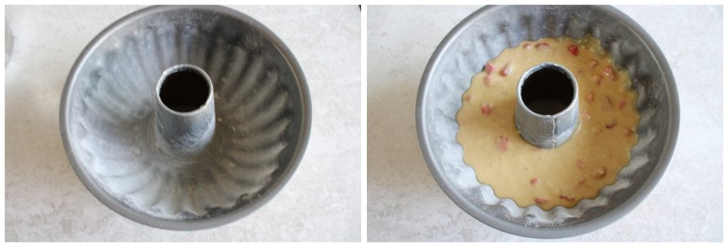 • Take a cake or bundt pan, 9.5 – 10 inches in diameter, butter and flour it well and pour the mixture inside; bake in the preheated oven for about 35 – 40 minutes (for me 37 minutes).