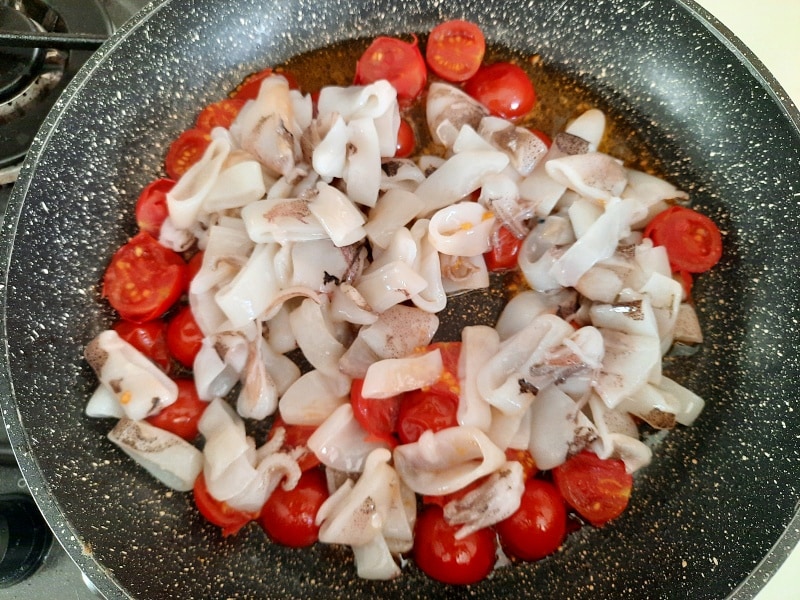 • Add the squid and continue cooking over high heat for about a minute. Also pour in the white wine and let it evaporate.
