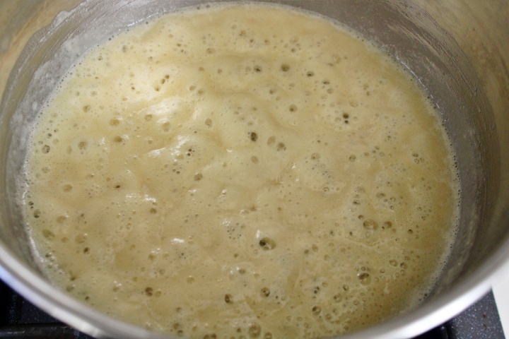 First, pour the milk with the butter and salt into a saucepan and bring almost to a boil. As soon as it starts bubbling, remove the saucepan from the heat and add all the flour at once.