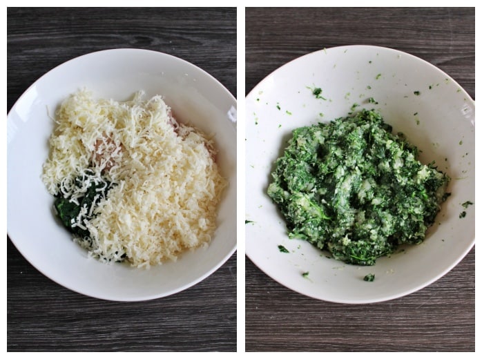 Once lukewarm, mince them and put them in a bowl along with the minced chicken*. Grate the Parmesan and the scamorza and add them to the bowl. Season with salt. At this point, mix well with your hands until you get a homogeneous mixture.