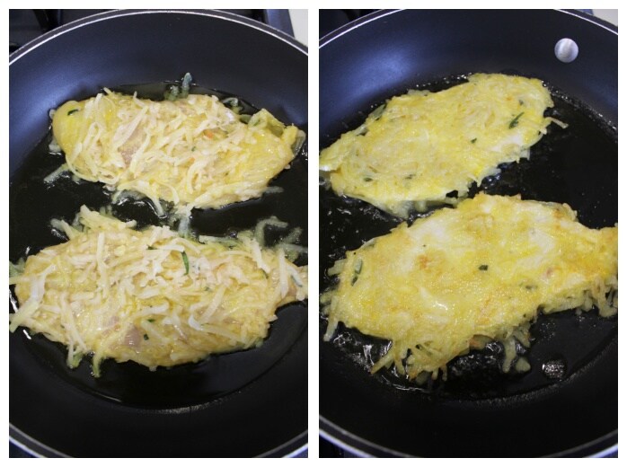 The recipe is really simple: I coated the chicken slices first in flour, then in beaten egg, and finally in grated and squeezed potatoes, seasoned with olive oil, salt, and pepper and flavored with rosemary. Then, I fried them in extra virgin olive oil until golden brown.