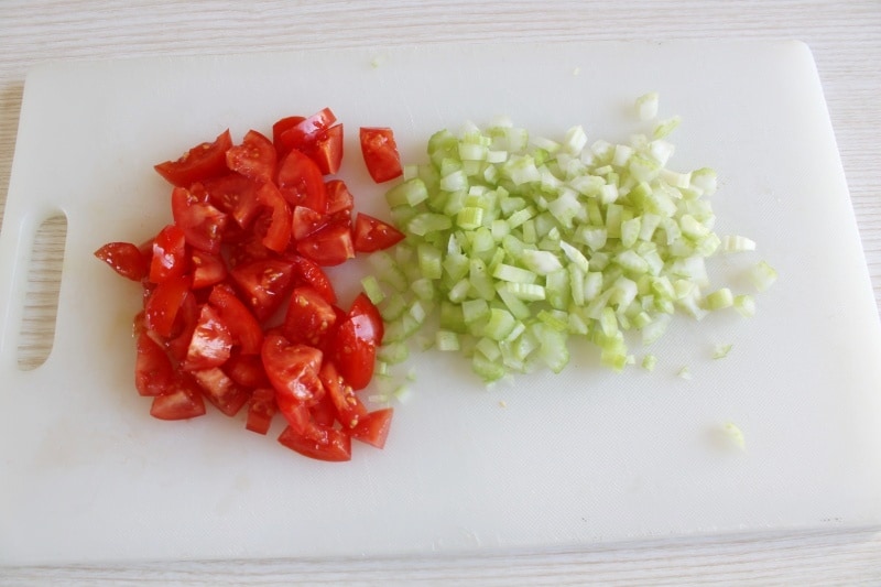 Wash the cherry tomatoes and cut them into pieces. Wash the celery stalks and slice them thinly.