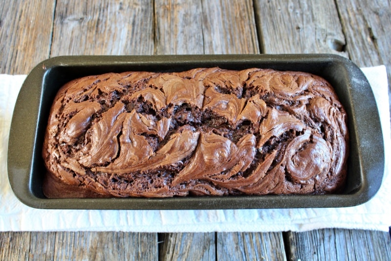 Pour 2 – 3 tablespoons of Nutella on the surface (if you want, you can also add it into the batter as well as on top) and use a skewer stick to create circles.