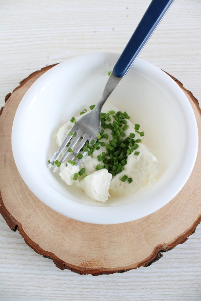 • First, place the stracchino and finely chopped chives (or arugula) in a small bowl, mix well with a fork.