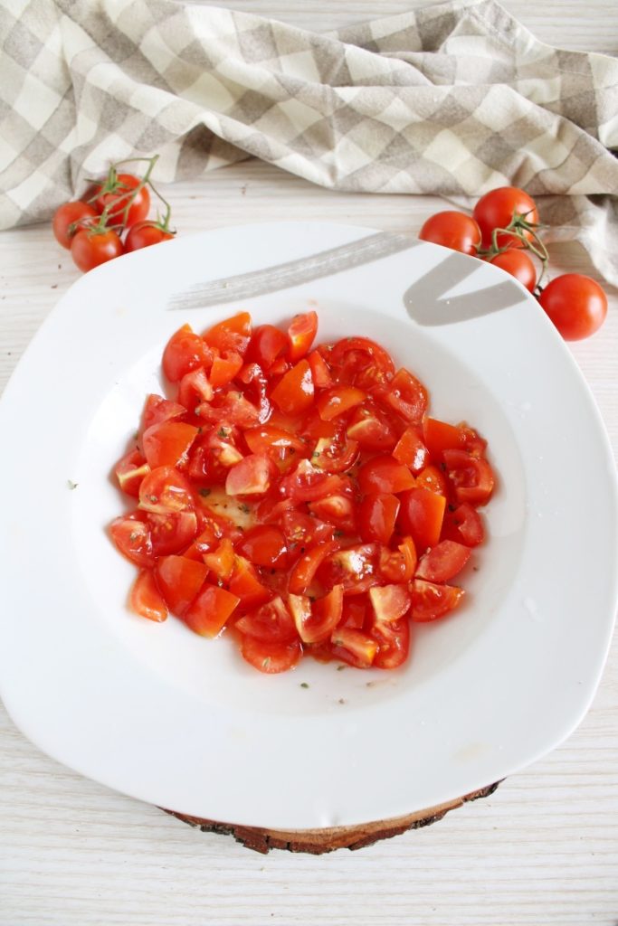 • Wash the cherry tomatoes, pat them dry with paper towels (or a clean kitchen towel), cut them into wedges and season with a drizzle of extra virgin olive oil, salt, and oregano.