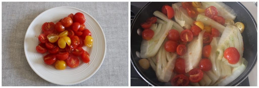 In the meantime, wash the cherry tomatoes and cut them in half, then add them to the skillet with the fennels; remove the garlic.