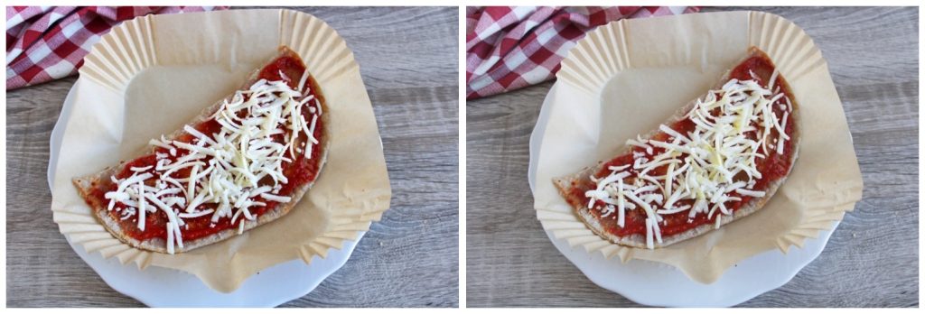 • Place the flatbread directly into the parchment paper specific for the air fryer, sprinkle the surface with some tomato sauce, a bit of cheese, and before cooking, drizzle with a little oil.