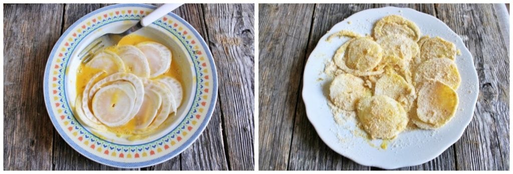 Meanwhile, beat the eggs in one dish and prepare the breadcrumbs in another. Then, dip the fennel slices first in the egg, then in the breadcrumbs.
