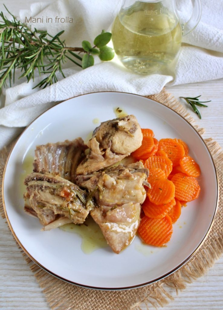It is prepared in a few simple steps. First, I made a mince with onion, sage, rosemary, and thyme which I sautéed in a pan with extra virgin olive oil. Then, I added the rabbit cut into pieces, browned it well on all sides, and finally deglazed with a generous glass of white wine. At this point, I covered the pan with a lid and let it stew gently for about 70 minutes until it was tender and fully cooked.