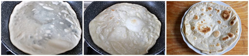Meanwhile, place a non-stick pan on the stove, quickly oil it with a kitchen brush, and once hot, gently place the flatbread, cook it for a few minutes (about 2 minutes), then flip it to the other side. As they cook, stack them on top of each other.