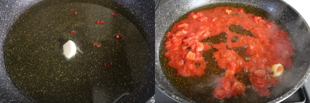 • In the pan (preferably cast iron or steel), generously heat the extra virgin olive oil with garlic and chili pepper (use generously). When the garlic is golden, add the tomato puree. Let it reduce until it darkens and the oil starts sizzling vigorously.