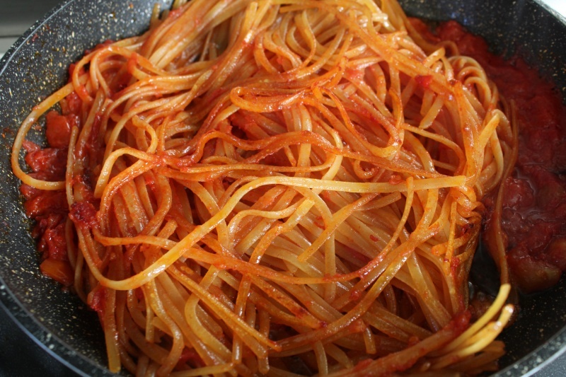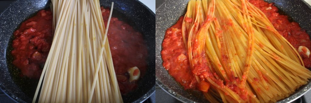 • Lay the raw spaghetti directly into the pan. Using tongs, gently move them so they get well coated with sauce and oil. Leave them still for a couple of minutes: they need to start “frying” and toasting, creating the first burnt spots.