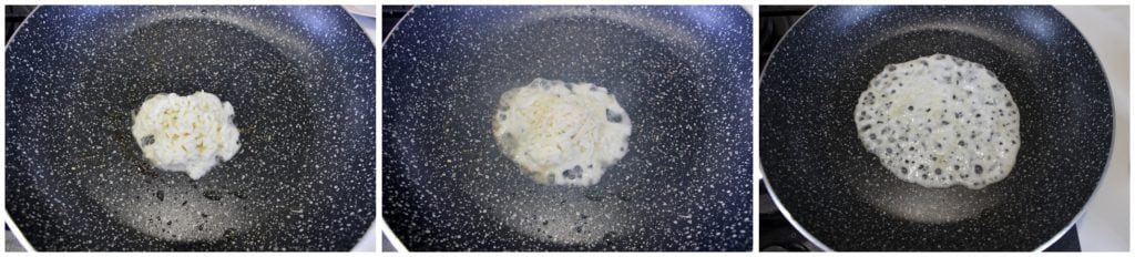 As soon as it starts to brown at the edges, using a spatula, push the edges towards the center, forming a thin and uniform circle (about 4 inches in diameter).