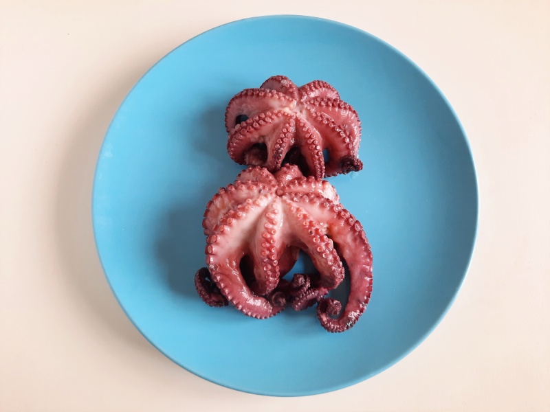 As soon as the octopus is cold, remove the suckers and cut it into pieces.
