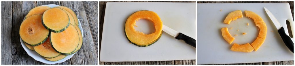 First, cut the pumpkin into slices about 1/4 – 3/8 inch thick; remove the seeds and inner fibers, and with a sharp knife, remove the skin.