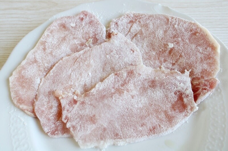 First, take the pork loin slices. If they are too thick, you can gently pound them with a meat tenderizer to make them thinner and tender. Dredge them in flour on both sides, shaking off the excess.