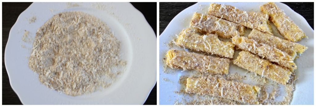 Meanwhile, in another plate, put the breadcrumbs and 2 tablespoons of grated Parmesan; blend well, then coat the sticks thoroughly in the breadcrumbs.