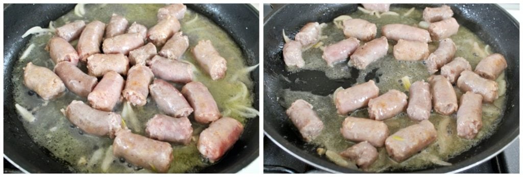 • First, in a large pan heat 4 tablespoons of extra virgin olive oil, add the onion, finely chopped, and let it turn golden, then add the sausage, cut into pieces: let it brown for a few minutes, stirring occasionally.