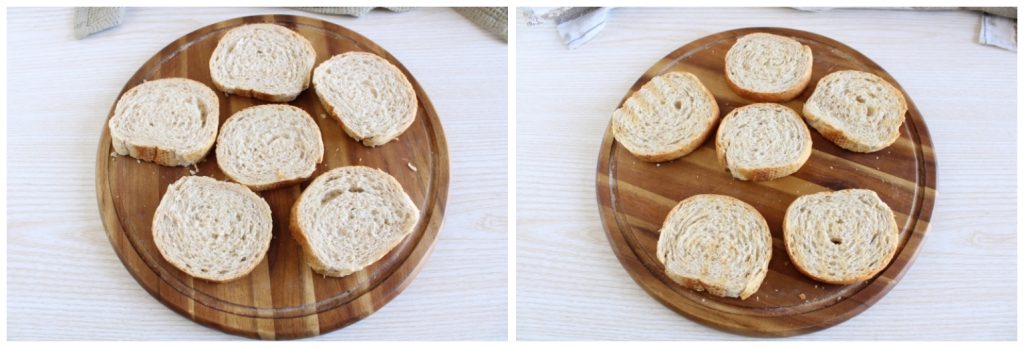 First, slice a baguette into slices about 0.4 inches thick and toast them on a grill or in the oven.