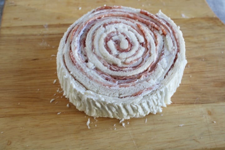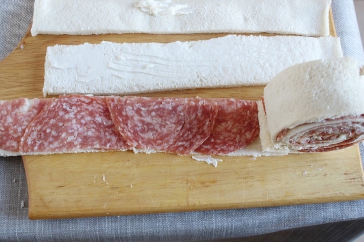 Basically, it’s a savory log but larger in size, made with rolled sandwich bread, filled with a layer of spreadable cheese (I used Philadelphia) and slices of Milano salami.