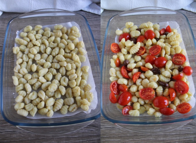• First, take a large baking sheet and line it with parchment paper. Pour the gnocchi directly from the package (raw, without boiling!), add the cherry tomatoes cut in half and the olives.