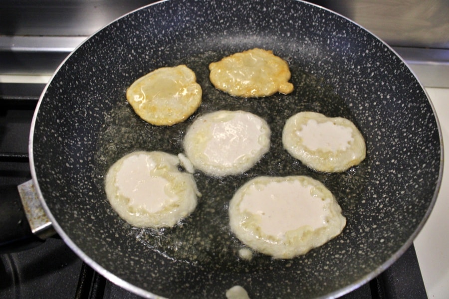 • Heat the oil in a pan, when hot, add the flour and water mixture using a spoon, and fry until golden brown, turning them occasionally with a spatula. As they cook, gently place them on a plate lined with kitchen paper, to absorb excess oil.
