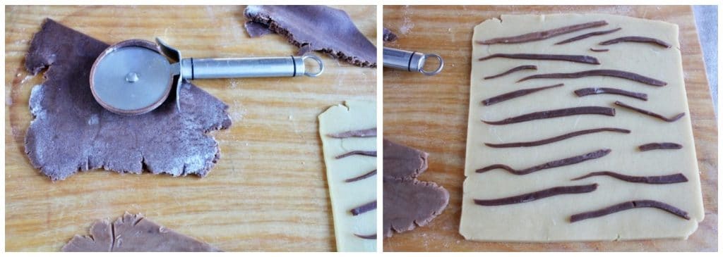 As I said before, they are very easy to make. First, I rolled out the white dough and with a pizza cutter I cut many strips of cocoa dough that I randomly placed on the white dough. I didn’t press them down with the rolling pin; I like them to be raised. Then, I cut them out and put them in the oven to bake.