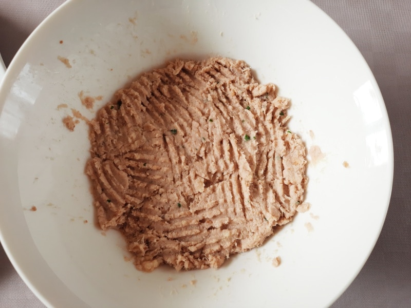 The process is very simple: after mashing the boiled potatoes, I mixed them with egg white and tuna, previously chopped together with parsley and the juice of half a lemon.