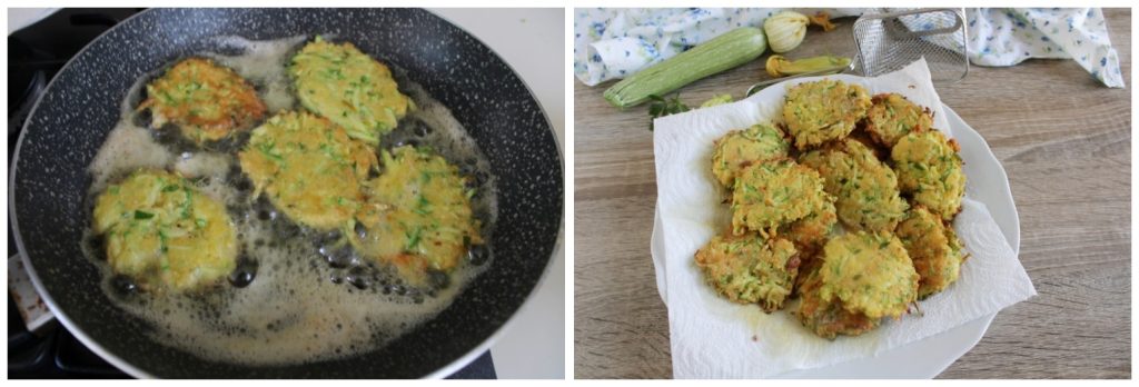 • When the fritters are golden and crispy on both sides (about 2-3 minutes each side), drain them with a slotted spoon and lay them on a plate lined with paper towels to remove excess oil.
