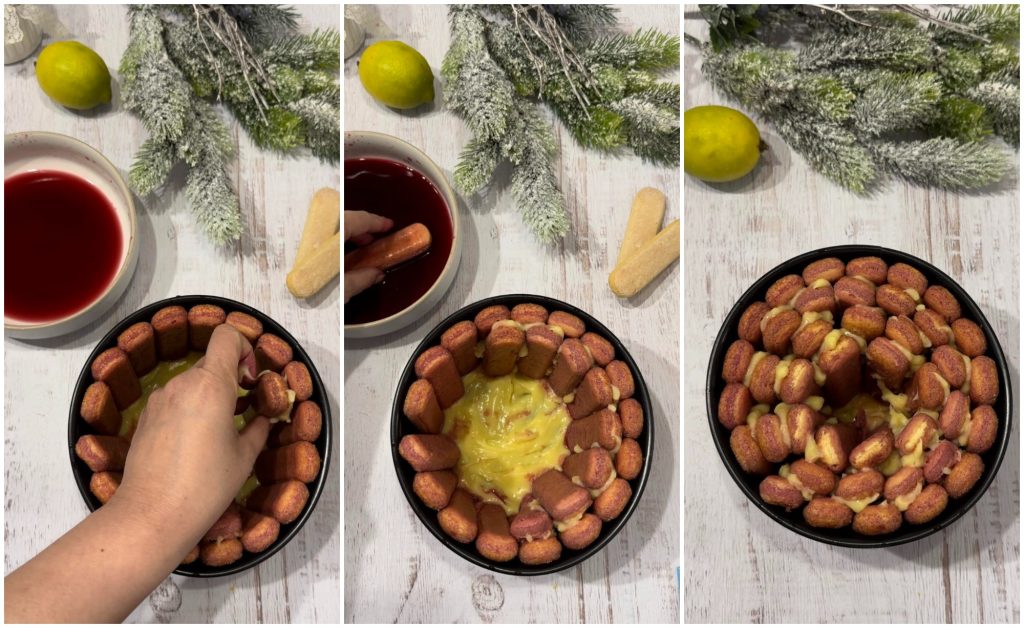 Take the ladyfingers and dip them, one at a time, in the Alchermes diluted in water (you can also use it pure).