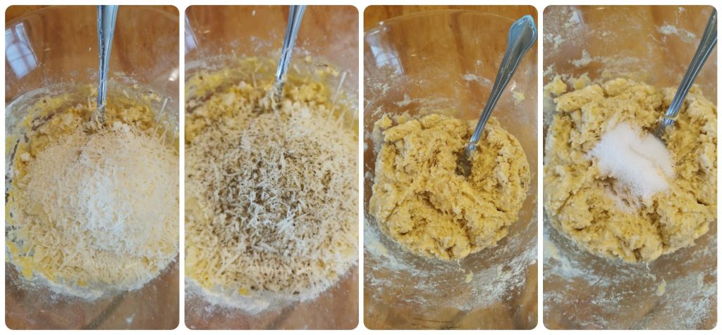 Incorporate the grated Parmesan and Pecorino cheeses and pepper. Mix again.
