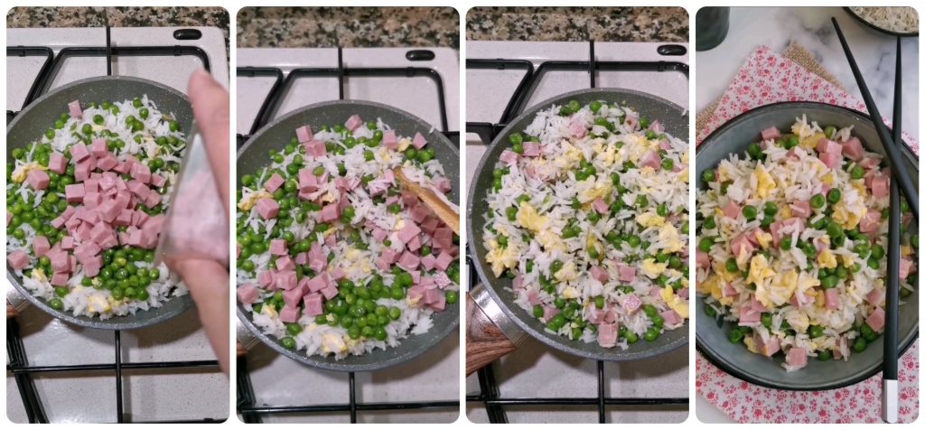 Meanwhile, peas are cooked, and scrambled eggs are prepared. Then everything is combined, along with cooked ham. Soy sauce to complete everything, and it’s ready to serve!