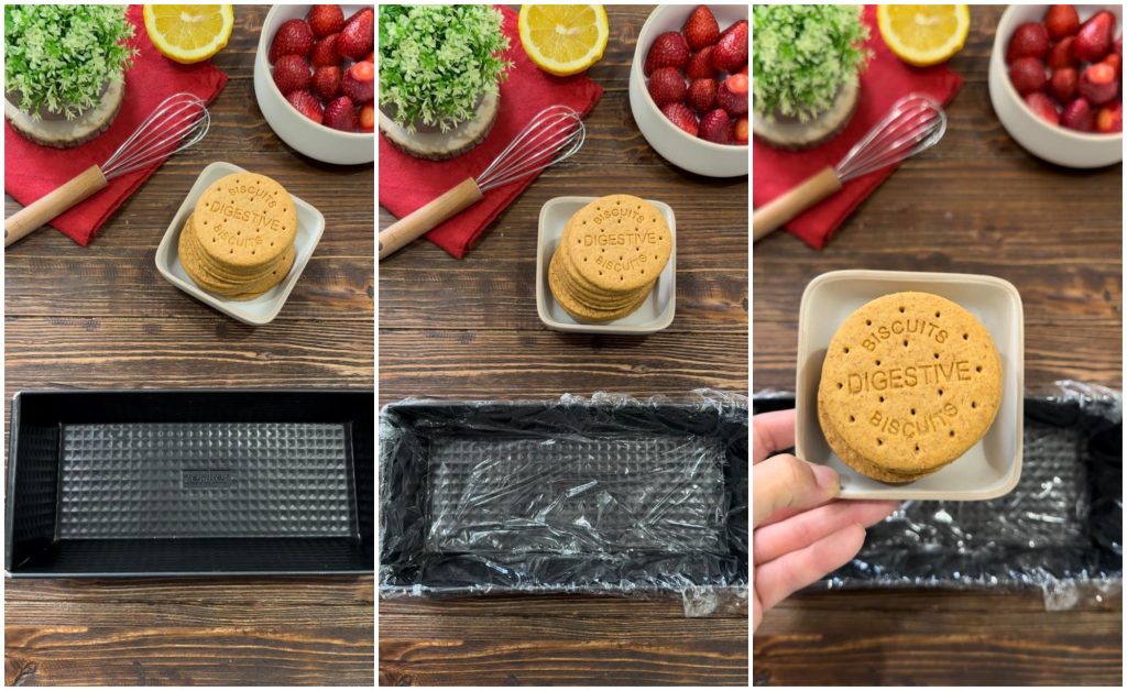 • In a bowl, pour a little milk and quickly dip the Digestive biscuits before placing them at the bottom of the pan and on all sides (I used 3 at the bottom, 3 on the sides, and 2 at the ends).