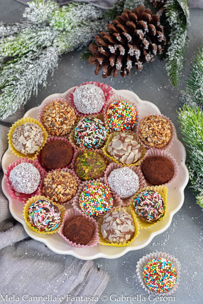 Once the mixture is prepared, many small balls are made, which are then rolled in pistachio crumbs (or hazelnuts or almonds), or in cocoa or shredded coconut. For an even more colorful and fun version, you can use sugar sprinkles and various kinds of sprinkles. I always have a nice stock of these products in the pantry that I use to decorate various treats.