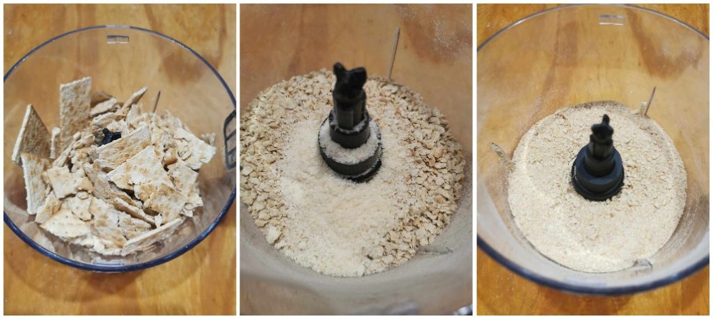 First, let’s prepare the base of the savory cheesecake! Put the crackers in a mixer and blend.